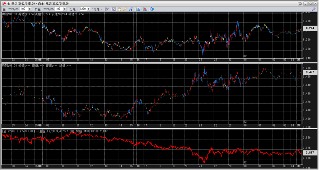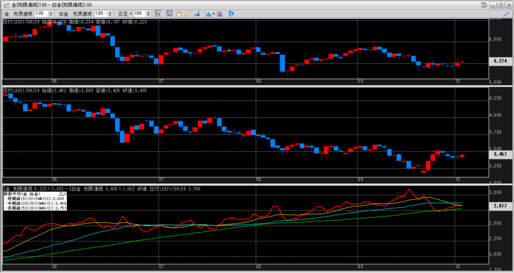 2021年10月1日8:45~10月2日6:00 金白金鞘値動きのチャートを張り付けています。