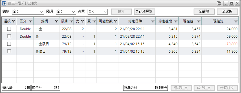 現在、鞘の仕掛けは、鞘拡大の仕掛け金買い1枚-白金売り2枚で