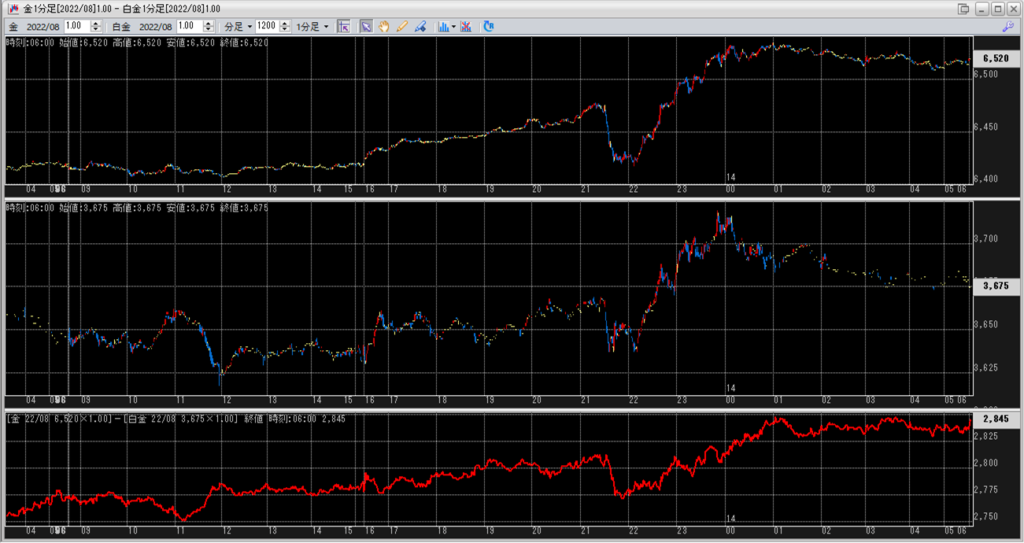 2021年10月13日8:45~10月14日6:00 金白金鞘値動きのチャートを張り付けています。