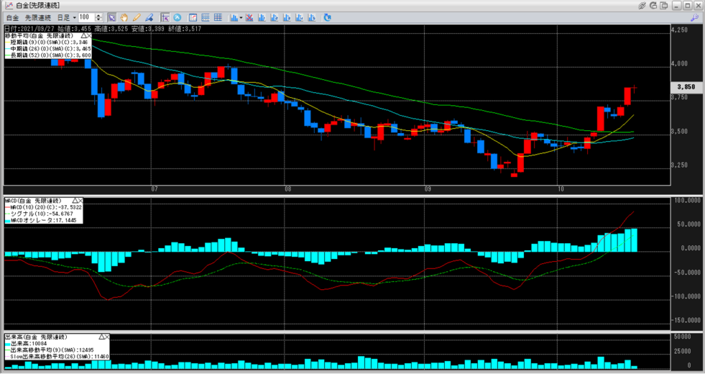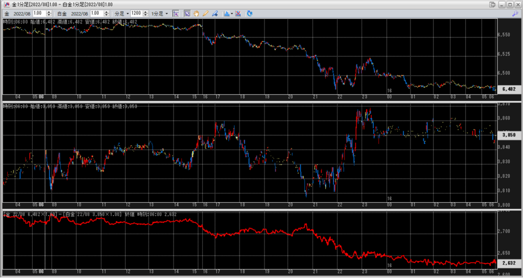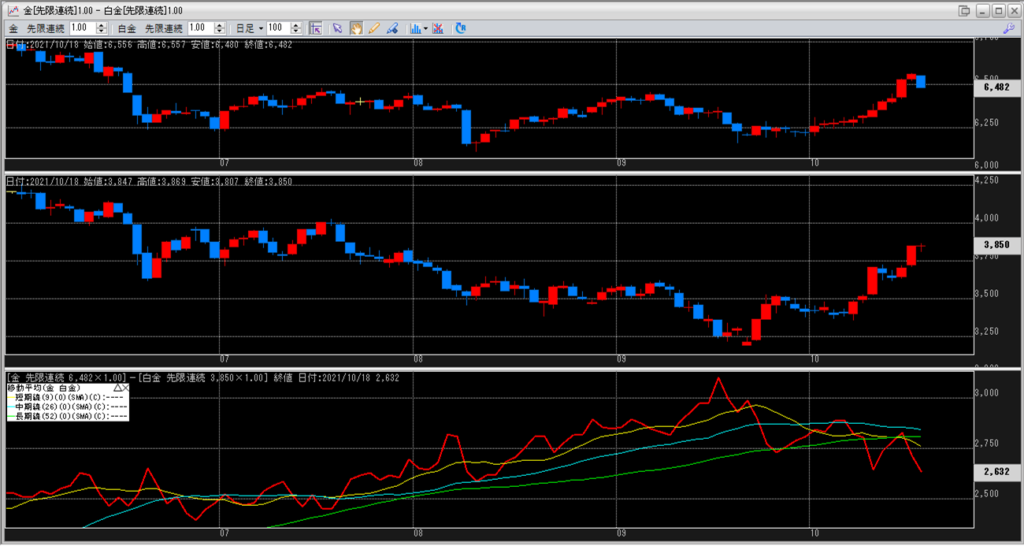 2021年10月15日8:45~10月16日6:00 金白金鞘値動きのチャートを張り付けています。
