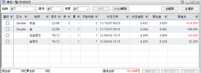 片張り金限日買い1枚と片張り白金限日買い1枚の含み損は11,300円になります。