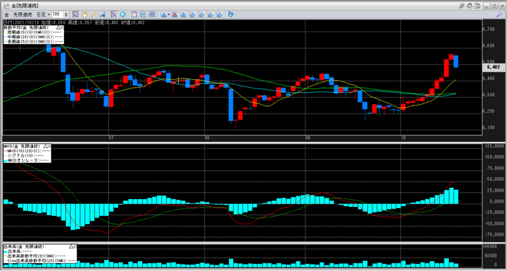 金は、6,450円を超えを維持し、12営業日連続陽線となるように反発できるのか。