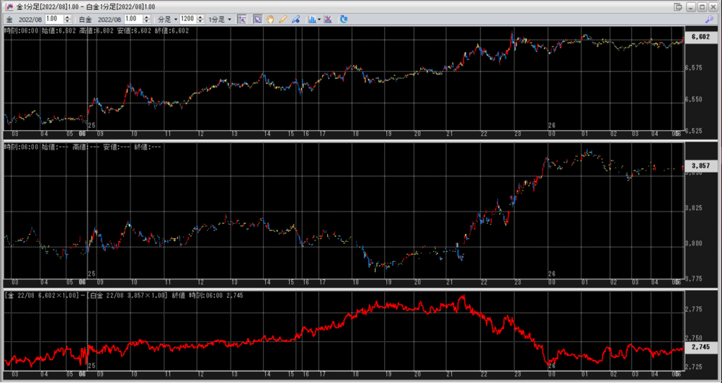 金白金の鞘の値段は、基準線に到達したものの、-1σまで鞘が縮小してしまうのか。