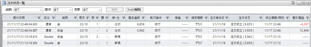 順張りしようと鞘拡大の仕掛け金買い1枚-白金売り2枚を
