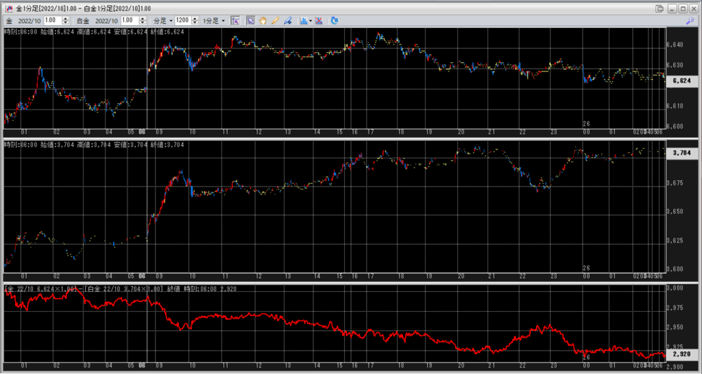 さて、また、鞘拡大の仕掛け金買い1枚-白金売り2枚を仕掛けるタイミングを