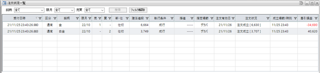片張り金限日買い1枚と片張り白金限日買い1枚の含み損は11,000円になります。