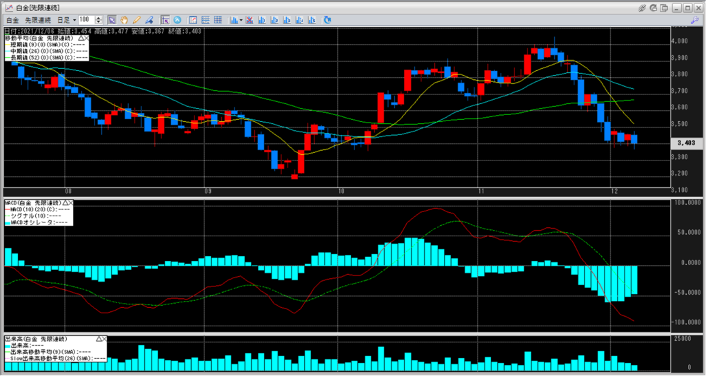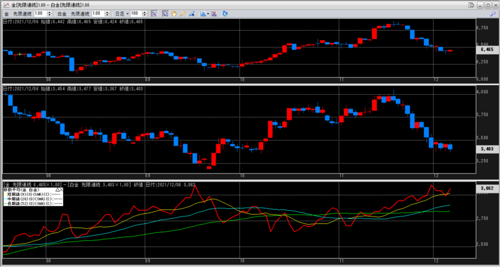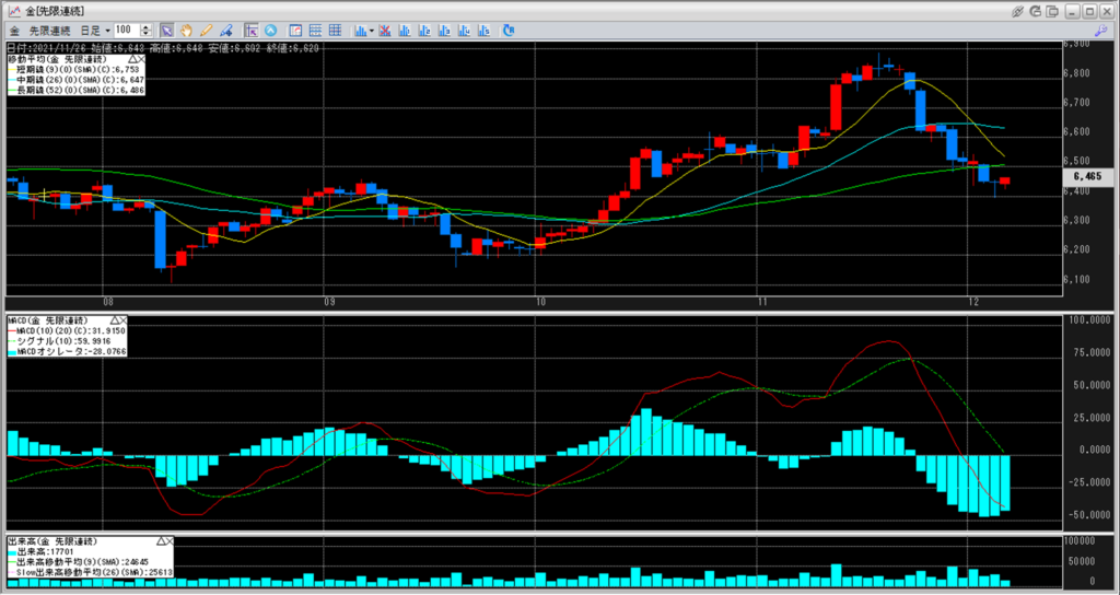 金は、移動平均線の中で一番下に位置している長期線を割り込んでしまったので、