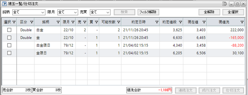 片張り金限日買い1枚と片張り白金限日買い1枚の含み損は58,100円になります。
