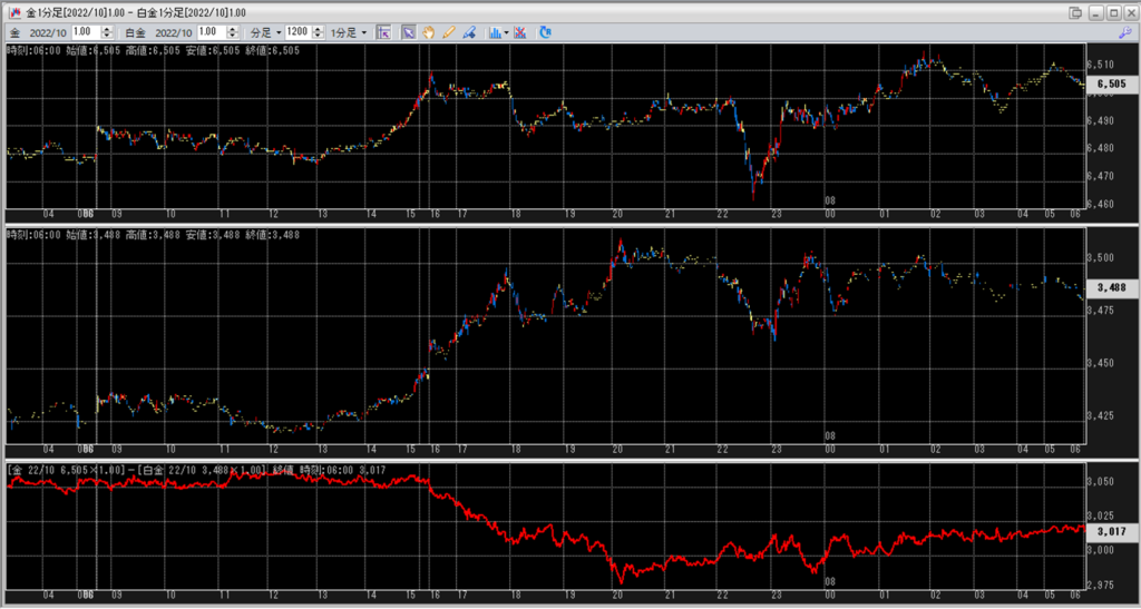 下:金白金鞘(金白金の価格差 = 金1グラムの価格 - 白金1グラムの価格)