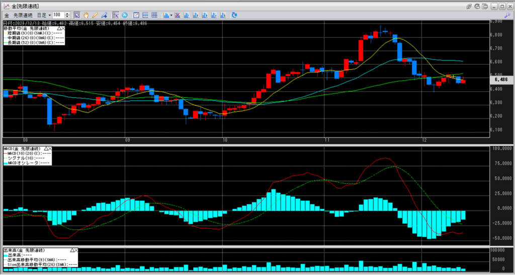 金は、移動平均線の中で一番下に位置している短期線に沿った値動きとなっているが、
