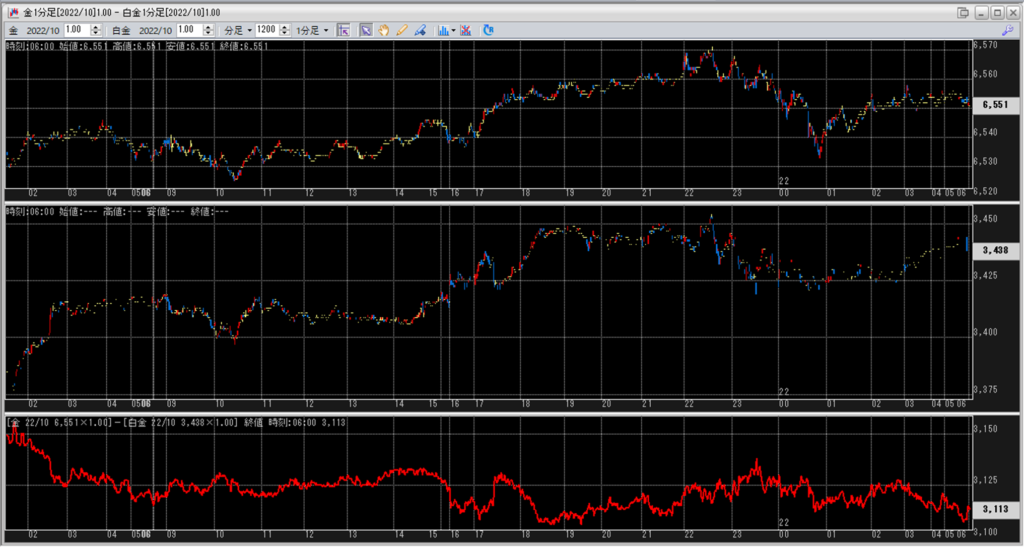 下:金白金鞘(金白金の価格差 = 金1グラムの価格 - 白金1グラムの価格)