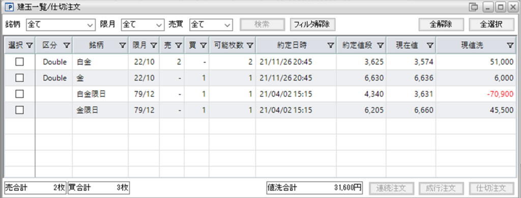 片張り金限日買い1枚と片張り白金限日買い1枚の含み損は25,400円になります。