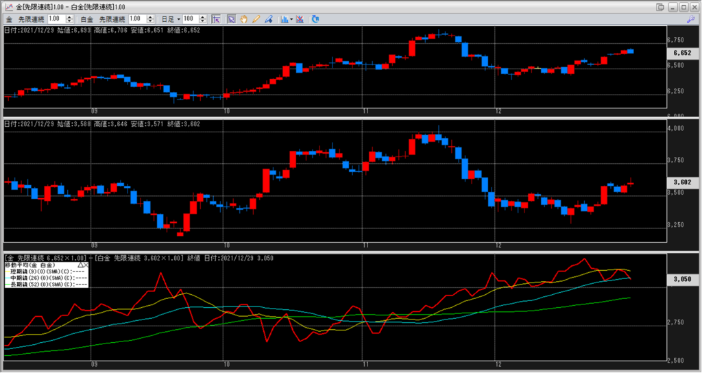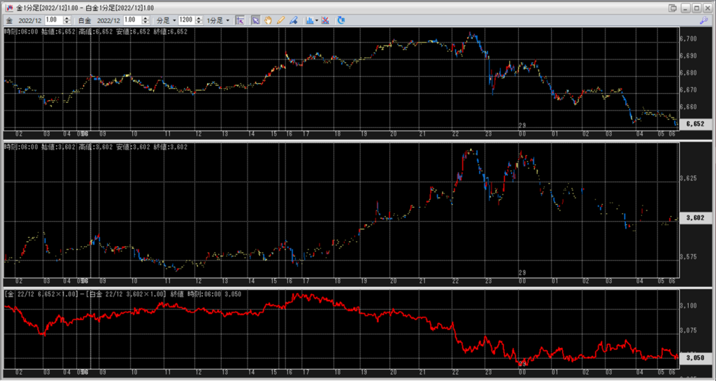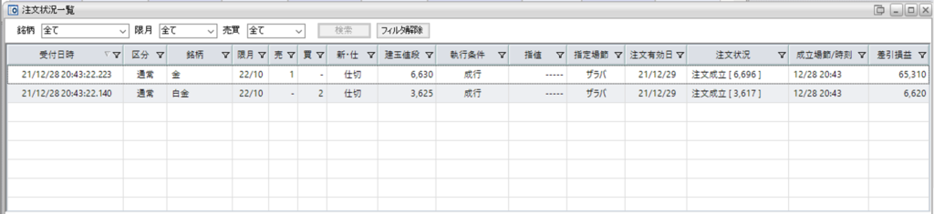 前述の通り、は鞘拡大の仕掛け金買い1枚-白金売り2枚を仕切っています。