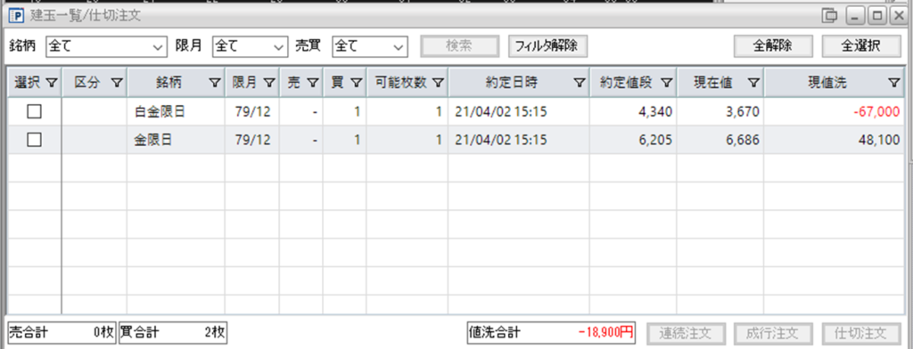 片張り金限日買い1枚と片張り白金限日買い1枚の含み損は18,900円になります。