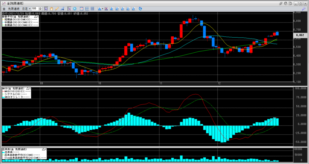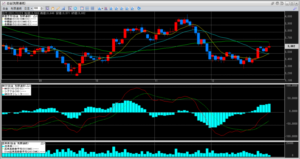 移動平均の短期線は上向き、中期線は下向き、長期線は上向きとなっています。