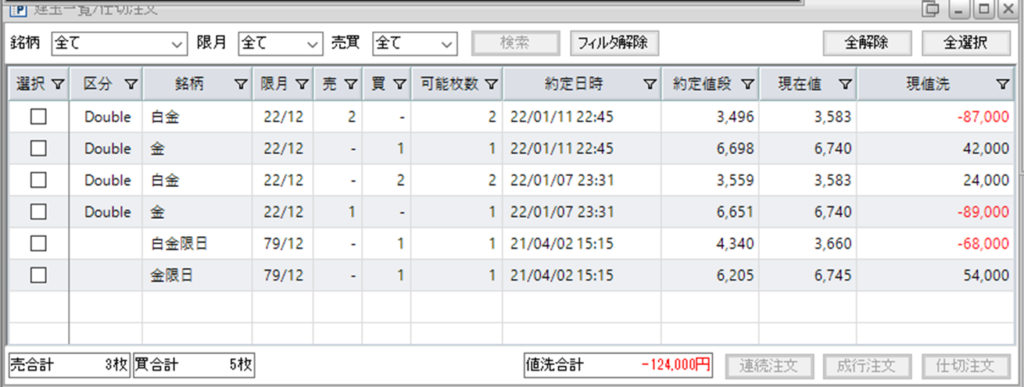 鞘拡大の仕掛け金買い1枚-白金売り2枚を建て、両建て状態にしてしまいました。