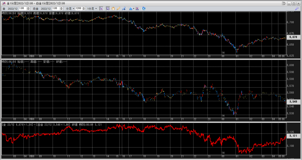 鞘拡大の仕掛金買い1枚-白金売り2枚を1組、保持しております。