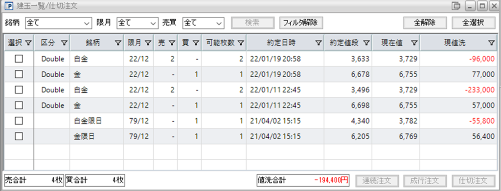 現在、鞘拡大の仕掛金買い1枚-白金売り2枚を2組、保持しており、