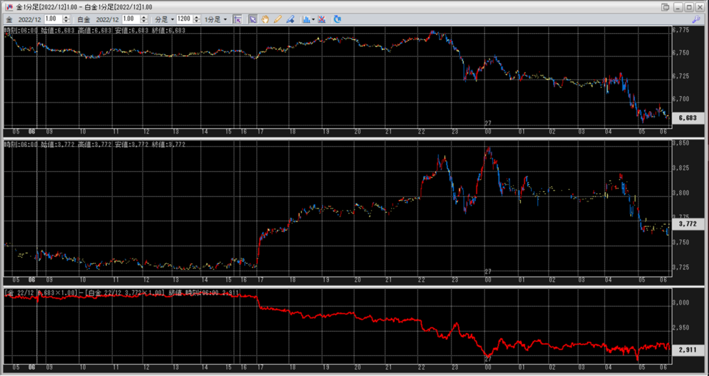 一時的に鞘縮小の仕掛け金売り1枚-白金買い2枚を建てていくのもありかもしれません。