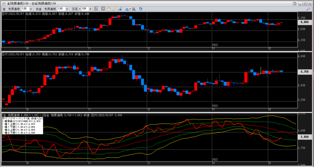鞘縮小の仕掛け金売り1枚-白金買い2枚を建てていくのもいいかもしれません。