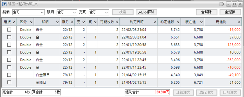 現在、鞘拡大の仕掛金買い1枚-白金売り2枚を3組、保持しており、