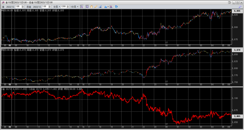 現在、鞘拡大の仕掛金買い1枚-白金売り2枚を3組、保持しています。