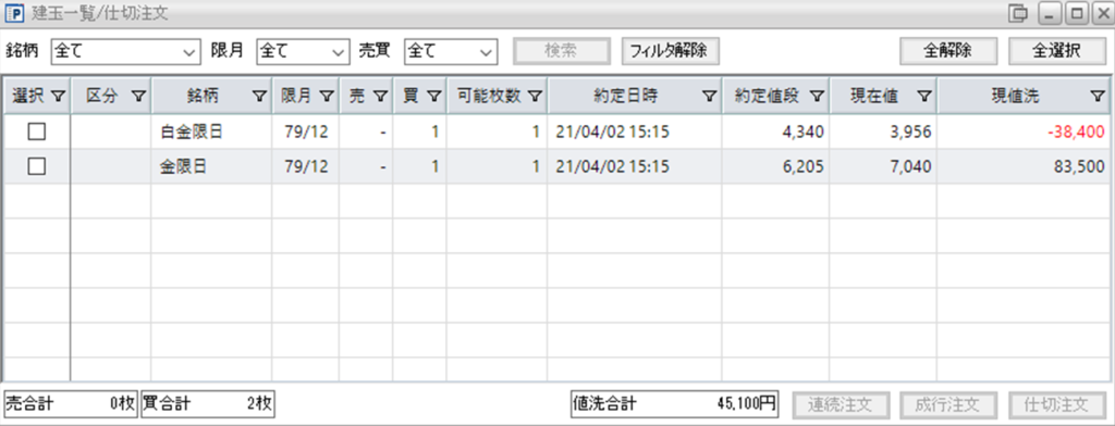 片張り金限日買い1枚と片張り白金限日買い1枚の含み益は45,100円になります。