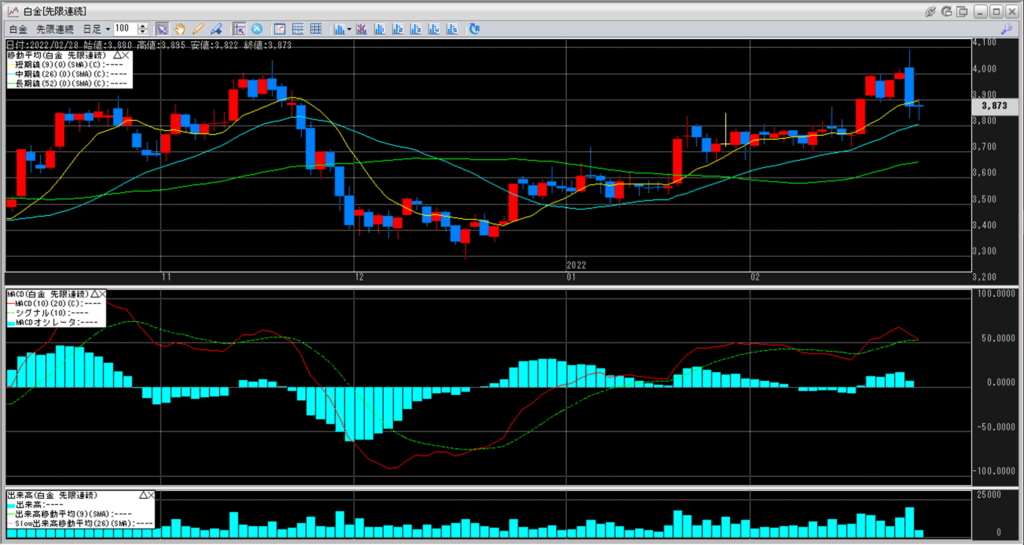 移動平均線の中で一番上に位置している短期線3,895円を割って