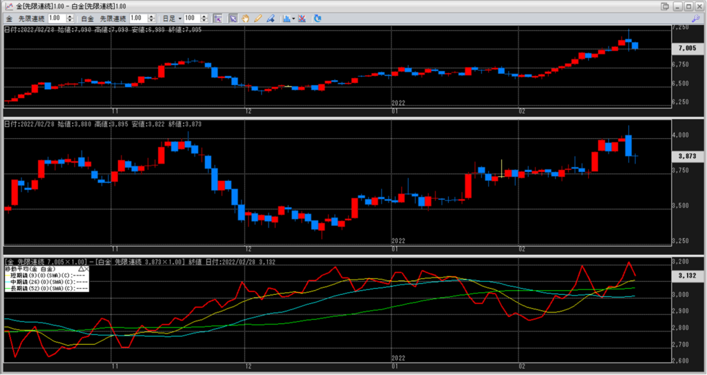 下:金白金鞘(金白金の価格差 = 金1グラムの価格 - 白金1グラムの価格)