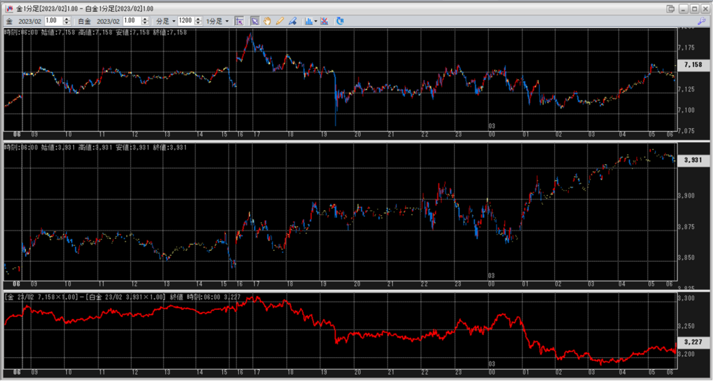 ここで鞘拡大の仕掛け金買い1枚-白金売り2枚を仕掛けていくべきか。