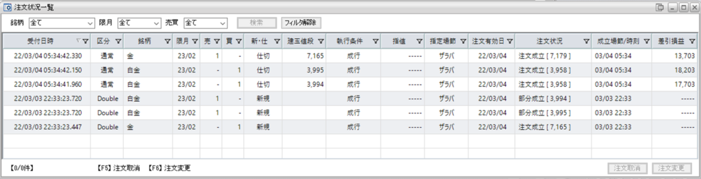 また、昨日、鞘拡大の仕掛け金買い1枚-白金売り2枚を建て、