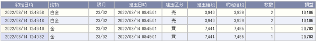 にも拘わらず、鞘拡大の仕掛け金買い1枚-白金売り2枚を利確し、