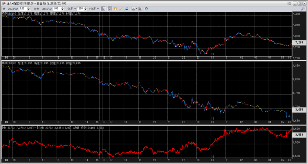 どこかで鞘拡大の仕掛け金買い1枚-白金売り2枚か、