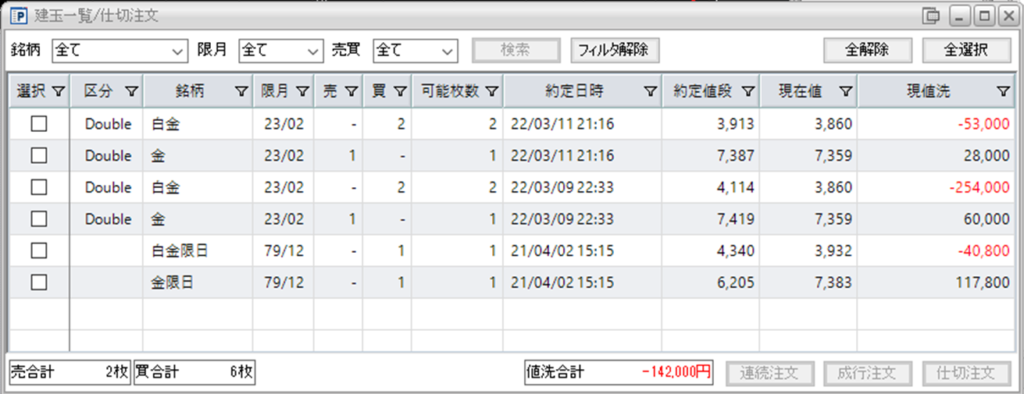鞘縮小の仕掛け金売り1枚-白金買い2枚の2組を保持しているにもかかわらず、