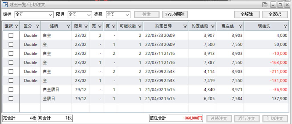鞘縮小の仕掛け金売り1枚-白金買い2枚を減らしていきたいと考えております。