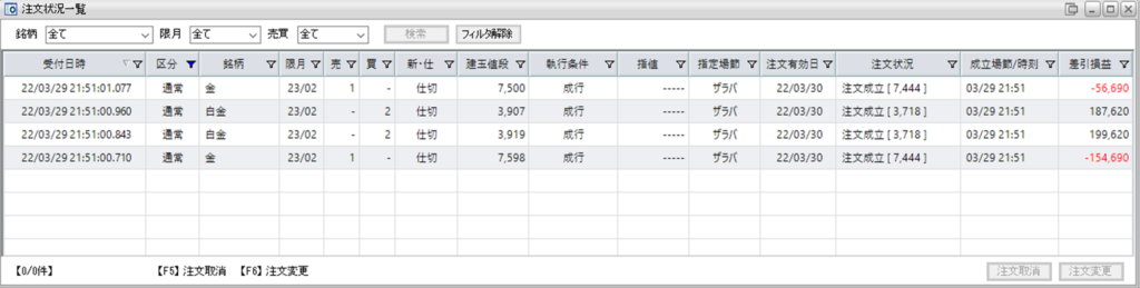 鞘も縮小へと向かったため、鞘拡大の仕掛け金買い1枚-白金売り2枚の2組を手仕舞い、