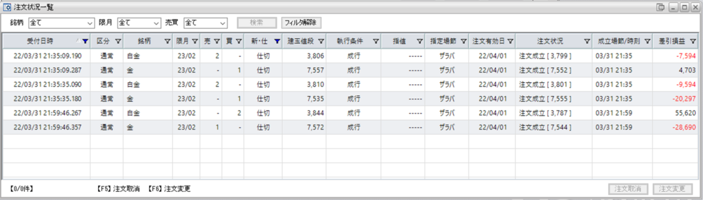 いい風に言えば、ヘッジ気分で建てている鞘拡大の仕掛け金買い1枚-白金売り2枚を