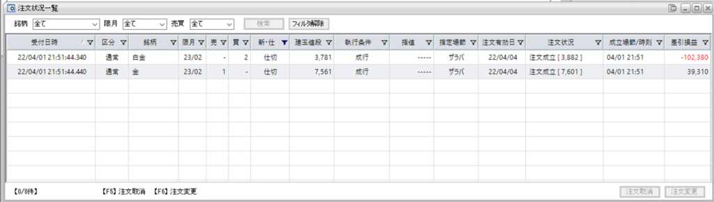 片張り金限日買い1枚と片張り白金限日買い1枚の含み益は98,800円になります。