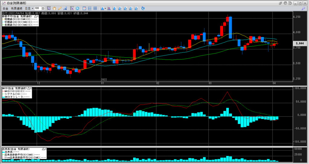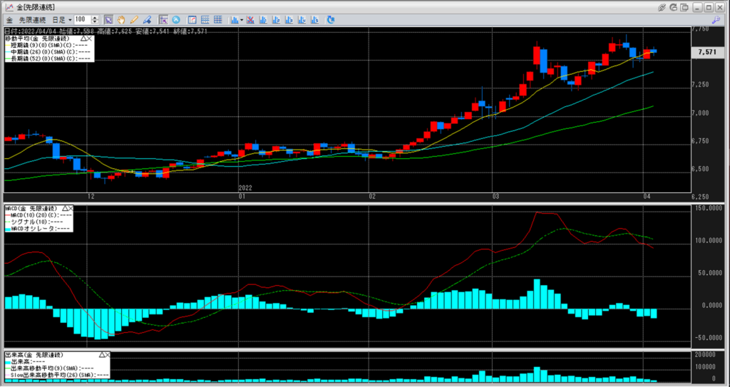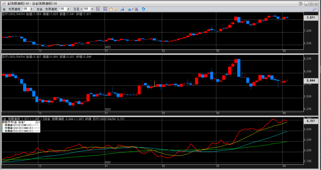下記に金白金の鞘の移動平均線のチャートを張り付けています。