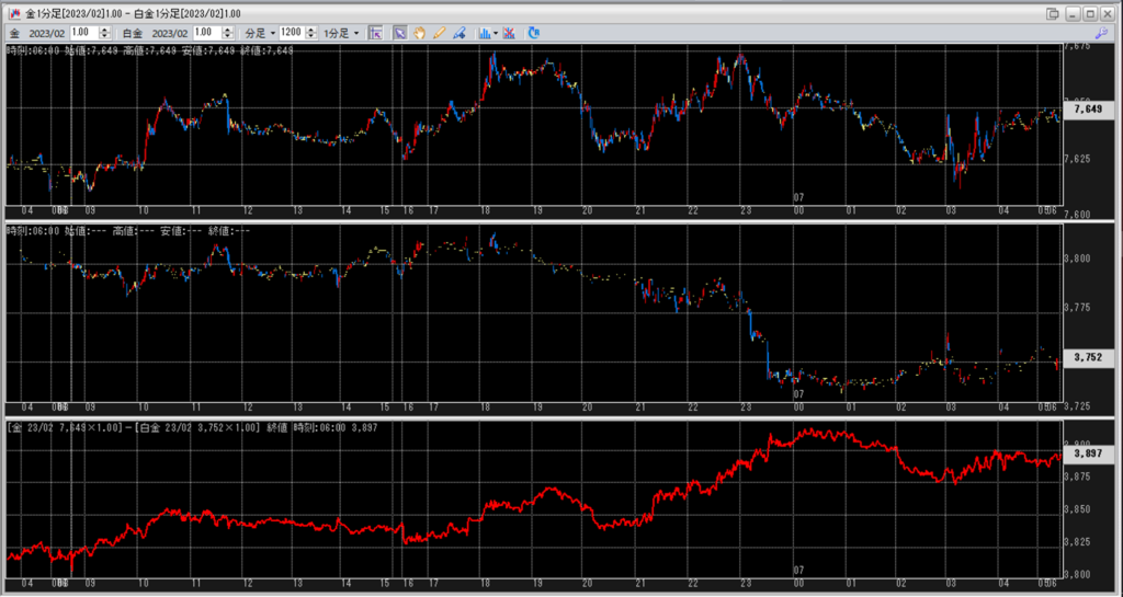 移動平均の流れとは逆の鞘縮小の仕掛け金売り1枚-白金買い2枚の3組は