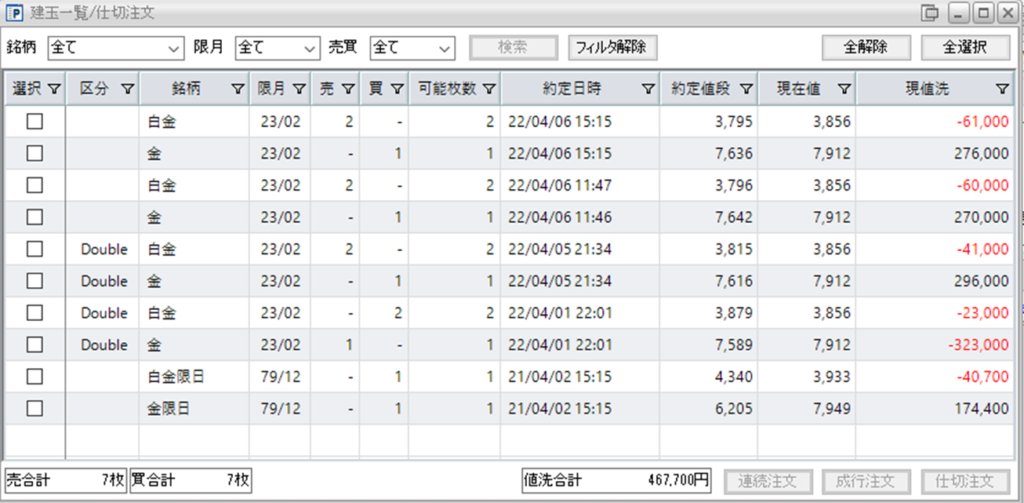 残りもう1組の鞘縮小の仕掛け金売り1枚-白金買い2枚も