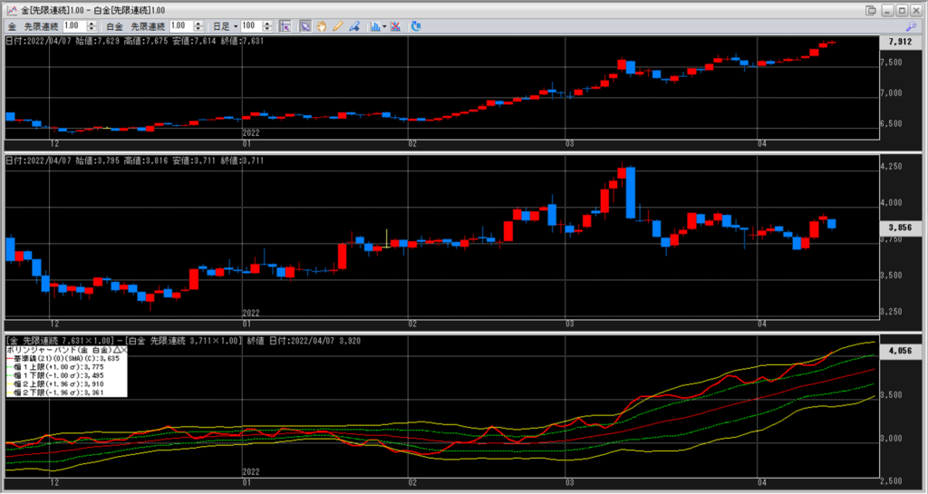 金と白金だけのチャートをそれぞれを見て考えると、鞘拡大しそうには見えます。