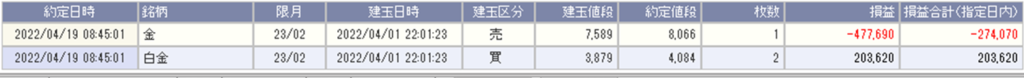 片張り金限日買い1枚と片張り白金限日買い1枚の含み益は172,200円になります。