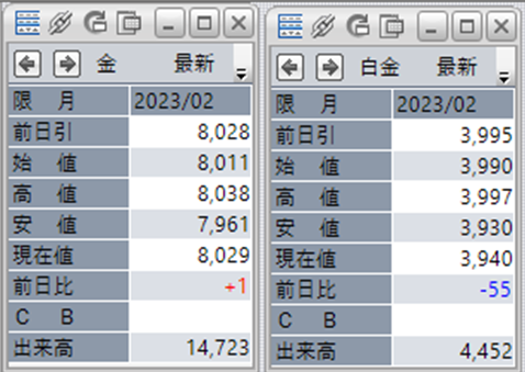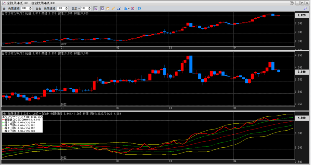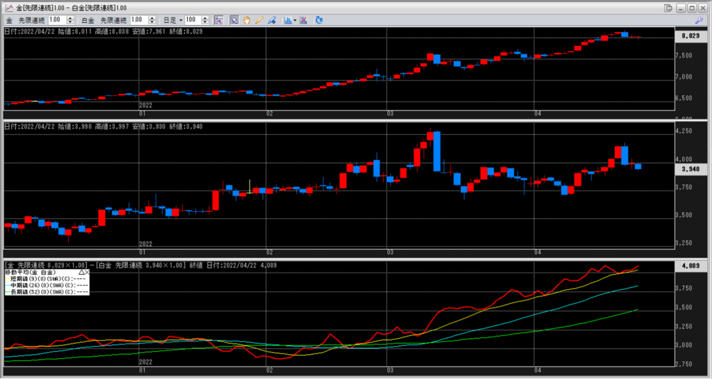下:金白金鞘(金白金の価格差 = 金1グラムの価格 - 白金1グラムの価格)