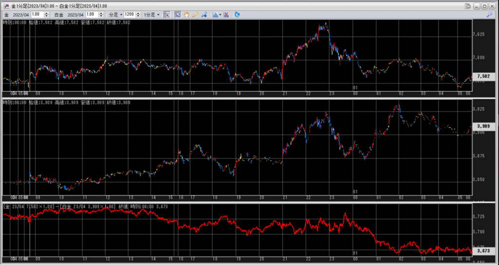 現在、金白金鞘拡大の仕掛け金買い1枚-白金売り2枚を1組、保持しており、