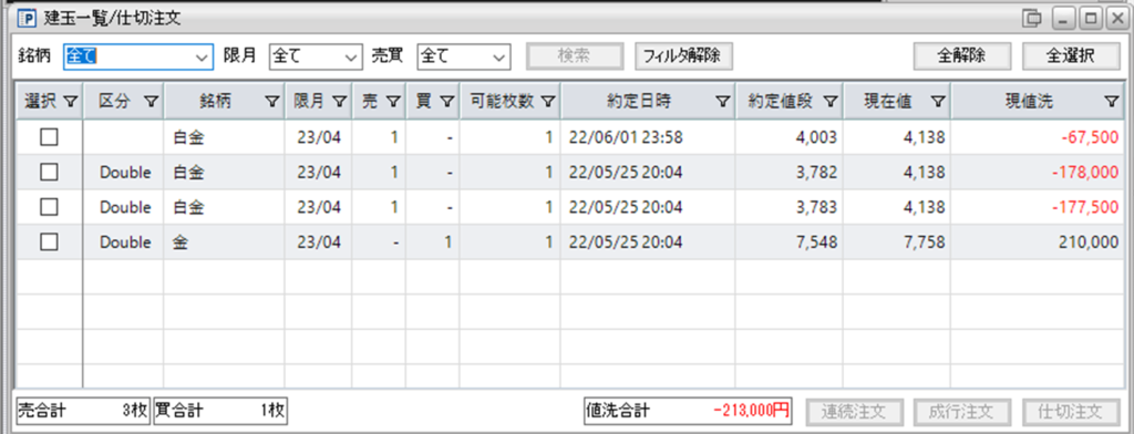 鞘拡大の仕掛け金買い1枚-白金売り2枚を1組、建てておりますが、