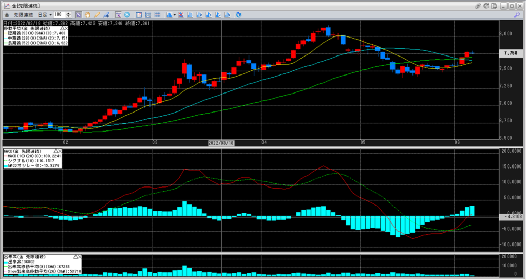 下記に金白金鞘の移動平均線のチャートを貼り付けています。
