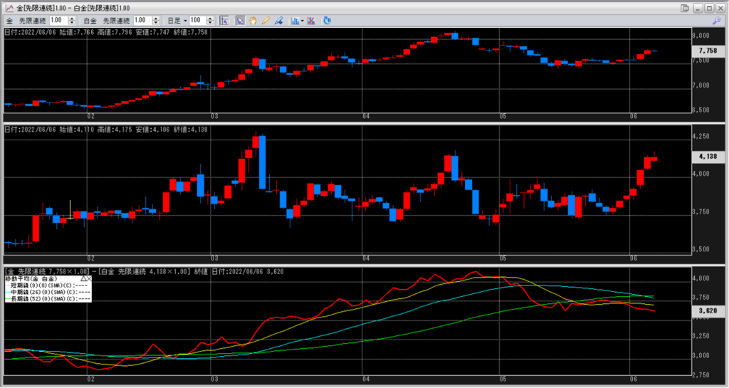 本日は、金白金の鞘の値段は移動平均線の中で