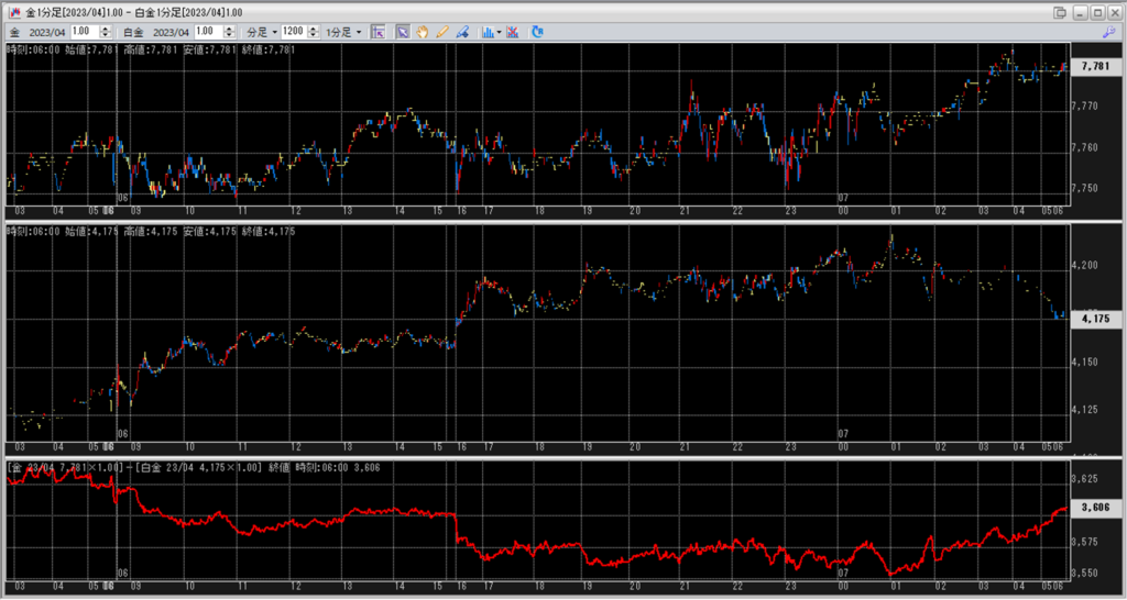 現在、金白金鞘拡大の仕掛け金買い1枚-白金売り2枚を1組と