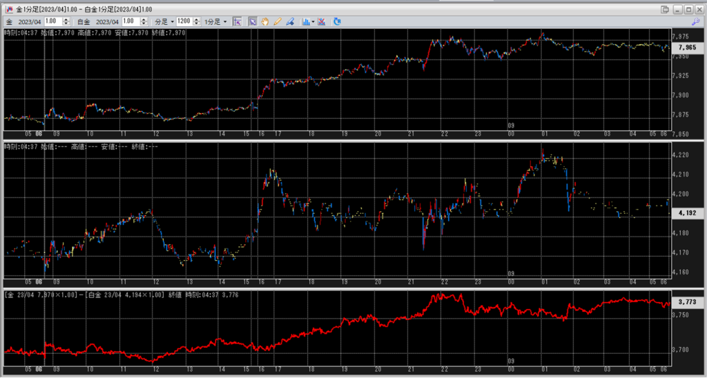 とりあえずは、鞘縮小の仕掛け金売り1枚-白金買い2枚の2組を保持しつつ、